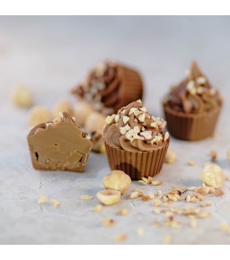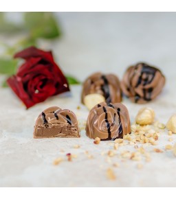 Milječna čokolada punjena pastom od lješnjaka s posipom od prženih lješnjaka.